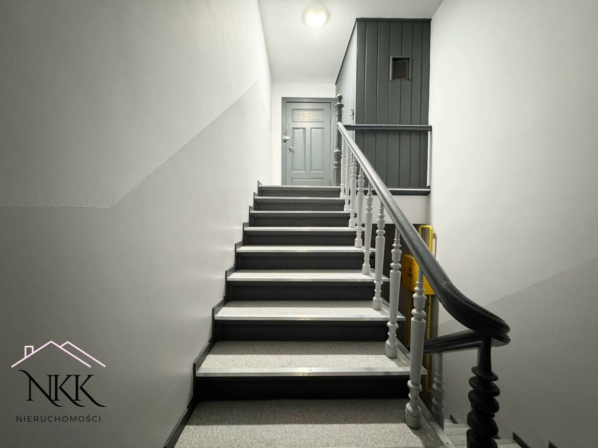 Klatka schodowa świeżo odnowiona pod koniec roku 2024. Wejście do kamienicy jest zabezpieczone domofonem.