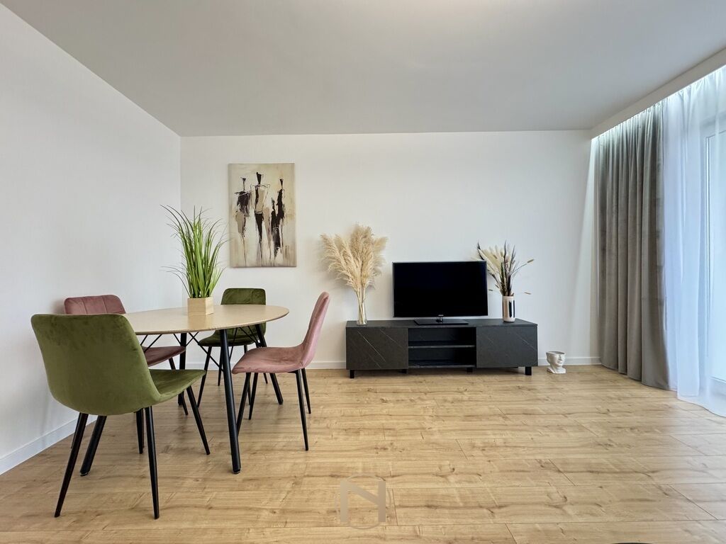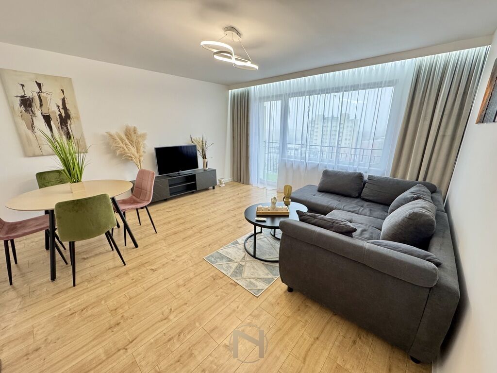 Przestronny salon z wyjściem na balkon oraz wydzieloną strefą