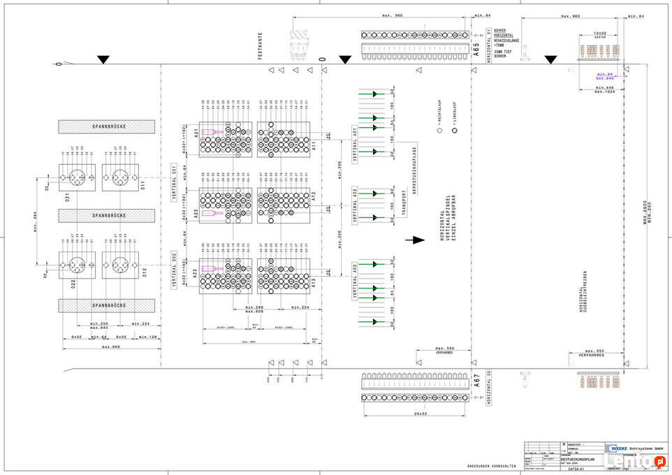 6 głowic wiertarskich (6 x Kw 2,3) z 40 wrzecionami pionowymi każda (łącznie 240 dolnych wrzecion)